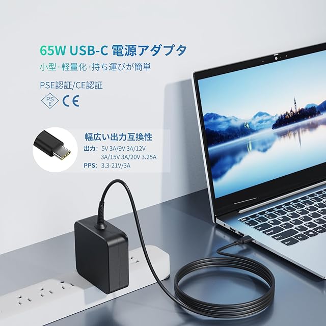 【商品情報】 入力:100V-240V 出力:5V 3A, 9V 3A, 12V 3A, 15V 3A, 20V 2.25A, 20V 3.25A ワット数:65W コネクタ:タイプc