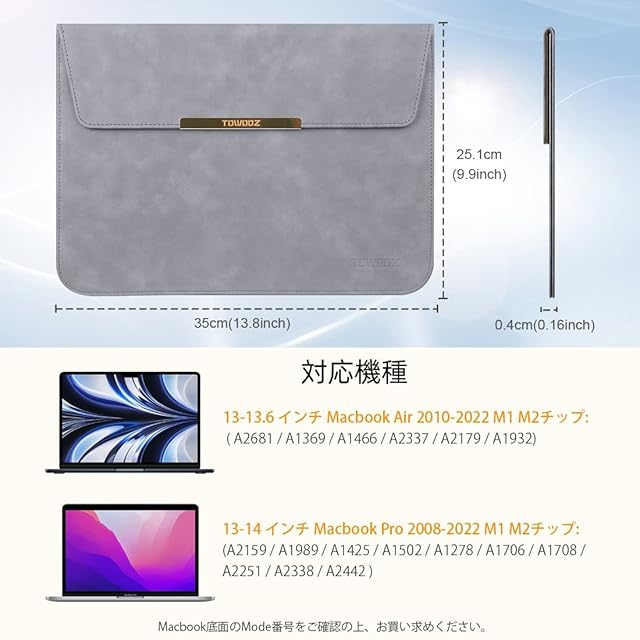 【対応機種】市販された13インチから13.6 インチのパソコンに対応可能。13-13.6 インチ Macbook Air 2010-2024 M1 / M2 /M3 チップス: (A3113 / A2681 / A1369 / A1466 / A2337 / A2179 / A1932); @13-13.3インチ Macbook Pro 2008-2024 M1チップス: (A2159 / A1989 / A1425 / A1502 / A1278 / A1706 / A1708 / A2251 / A2338) Macbook底面のMode番号をご確認の上お買い求めください。ご注意:本製品は薄型のため、透明なプラスチックケースとの併用には適しません。