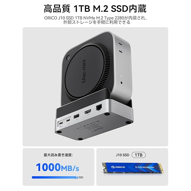 ORICO MiniDock Mac mini M4用スタンド ドック 10-IN-1 USB-Cハブ 内蔵 SSD 1TB NVMe M.2 Type 2280 10Gbps高速転送 100W PD対応 SD/TFカードリーダー HDMI USB3.2 1000Mbpsイーサネット ドッキングステーション (Mac mini M4/Pro対応) | SHOP RUNA