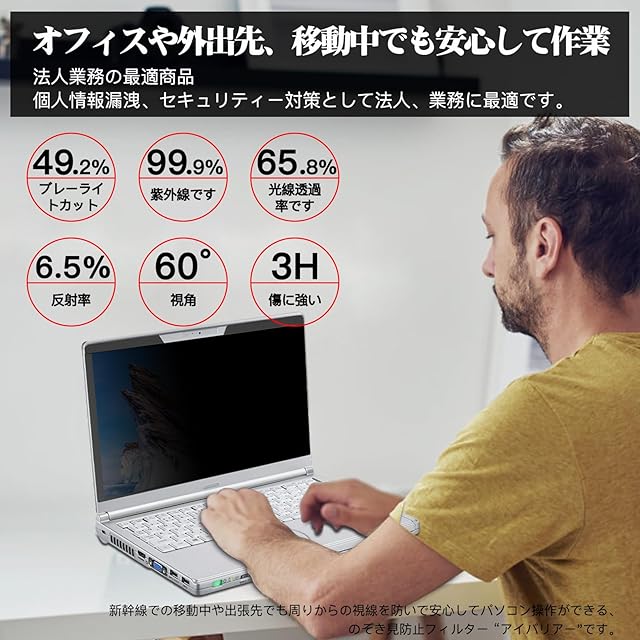 <p>●フィルムの特徴</p> <p>・パソコン画面の、左右からの覗き見を防止。プライバシーを守ります。</p> <p>・周囲の明かり(蛍光灯や太陽光)の映り込みを抑え、画面を見やすくします。</p> <p>・目の負担を軽減する反射防止タイプで、長時間の作業に最適です。</p> <p>・キズが入りにくく、傷や汚れから液晶画面を保護するハードコート仕様です。</p> <p>高品質なフィルターを使用しています。</p> <p>・紫外線99%カット</p> <p>・ブルーライトカット率:約48%</p> <p>・厚さ0.4mm</p> <p>・ハードコート加工 硬度4H</p> <p>・低反射防止(1.00%以下)</p> <p>・透過率75%以上</p> <p>・干渉膜モアレを防ぐフィルター構造</p> <p>●取付方法</p> <p>・付属のシールを四隅に貼って画面に取り付けるだけの簡単装着。</p> <p> 両面テープを使用してフィルターを装着、取外しされる場合、液晶画面を傷つける恐れがありますのでご注意ください。</p> <p>・マウンティングタブを利用して、スライドして取り外し可能な状態で装着。</p> <p> ただし、フルフラットなタイプの画面(液晶画面とその周りの部分に段差がないもの)の場合、</p> <p> マウンティングタブを利用して、スライドして取外し可能な状態で装着することが難しく、</p> <p> 両面テープでの固定しかできない場合がございます。</p> <p>・タッチパネル・タッチペンには対応しておりません。</p> <p>●内容物</p> <p>・のぞき見防止フィルター × 1</p> <p>・貼り付けシール × 8</p> <p>・マウンティングタブ × 4組</p> <p>・クリーニングクロス</p> <p>