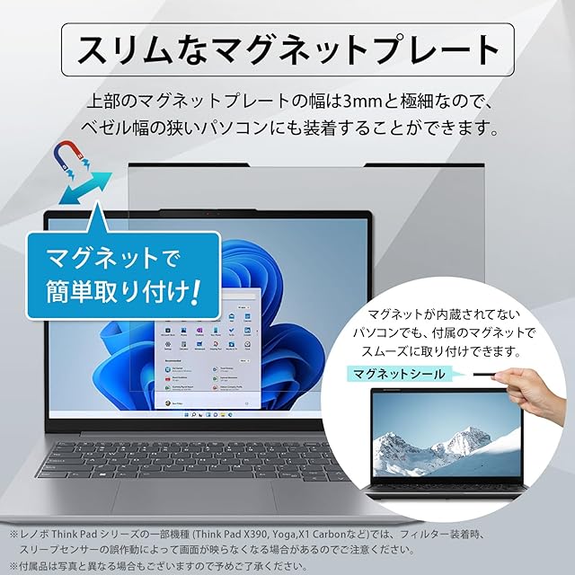 【ほど良い透過率】透過率は72%なので、ずっと装着していても違和感を覚えずにお使いいただくことができます。 【ビジネスシーンで活躍】当フィルターは新幹線、飛行機、カフェ、職場など仕事でパソコンを使うシーンで重宝されるため、法人のお客様から多数ご利用をいただいています。 ※非対応機種:レノボ Think Pad シリーズの一部機種 (Think Pad X390, Yoga,X1 Carbonなど)では、フィルター装着時、スリープセンサーの誤作動によって画面が映らなくなる場合があるのでご注意ください。その場合は、マグネットの位置をセンサーからずらして調整することによって改善される可能性があります。