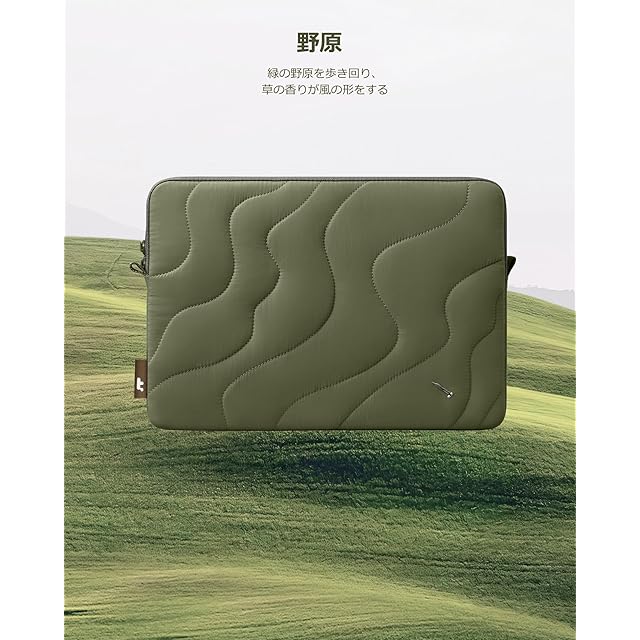 【地球の美学をテーマした】大自然の広大な風景の美しさからインスピレーションを得たTerra-A27 キルティングパソコンスリーブは、地球の驚異的な地形を描きます。地球の歌に共鳴する方々のために作られたこのノートPCケースは、エレガンスと環境保護を融合させています。不規則な曲線のデザインは、独特の風景を描き、あなたの大切なMacBookを優雅に包み込むように構えます。<br/> 【ハイグレードの持続可能性やオールグリーンの革新】Terra-A27 パソコンスリーブの100%生地は環境にやさしいリサイクルエコ生地を採用し、人間と自然が共生する世界へ取り組んでいきます。リサイクルして作られたナイロンの外装から、信頼できるYKK製NATULON Plusのエコジッパーに至るまで、あらゆる細部は厳選されており、環境と人間の優美な共生を描きます。<br/>【軽量でふっくら】外装に柔らかいくて軽量な表地を採用し、ふんわりとしたデザインにて、羽のような柔らかさたふんわりとした手触りを実現し、柔らかさと耐久性が兼ね備えます。軽量でスリムですので、他のバッグにも簡単に収納できます。<br/> 【信頼できる優れた保護力】ケースの四角に特許取得済みの「CornerArmor」ゴムクッションを配し、最も厳しい状況でもMacBookを守り、移動中の落下や衝撃に対して耐久性があります。内装に、環境に優しいエコ生地はフランネルのようにふわふわで、クッションパッドも入り、地球の優しい歌とともに無類の保護力でデバイスを保護します。<br/> 【製品仕様】ピッタリフィット:13-13.6インチ MacBook Air 2025-2018 (モデル:M4/A3240 M3/A3113 M2/A2681 M1/A2337 A2179 A1932) | 13インチ MacBook Pro 2024-2016 (モデル:M2/A2686 M1/A2338 A2251 A2289 A2159 A1989 A1706 A1708)。13インチ iPad Pro M4 / 13インチ iPad Air M3 M2 / 12.9 iPad Pro 6-3世代 にカバー無 | 12.3-13インチ Surface Pro | HP Pavilion Aero 13 | NEC LAVIE N13 Slim / SOL | 富士通 FMV UHシリーズ 2018年から | Dynabook GA/ZYにも対応。内寸: 30.5×21.5×2 cm、外寸:35.5×25×3.5cm。