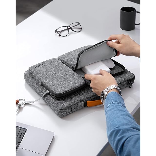 【スマートな3室サブ収納】このノートPCケースは二つ大きなフロントポケットが備え、その中に多数な小さいポケットやAirTag /鍵掛用ストラップを配します。電源、ケーブル、ハブ、Kindleなどのガジェットをすっきり収納できます。それに加え、背面にも大きなポケットがあり、書類やよく取り出す物の収納に適します。