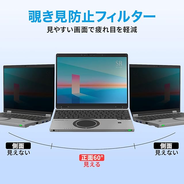 ●画面の正面を中心に60度(左右30度)より外の角度からは画面がまっ黒に見えるため、オフィスや、カフェ・電車内など外出先でもプライバシーを保護しながら安心して作業に集中することができます。<BR><BR>●ブルーライトカット率:49%、紫外線カット率:99.9%。目の負担を軽減し、長時間の作業に最適なフィルムとなっています。<BR><BR>●はめ込み型 : 取り外し・取り付け簡単。 フィルター左右と下部の突起をパソコン画面の溝にはめ込むだけ簡単に装着ができます。外すときは上部のつまみを持って手前に引いて取り外しができます。<BR><BR>●アンチグレア加工により、外光や照明などによる反射、ギラつきを軽減し画面が見やすくなります。<BR><BR>◆対応機種 : Panasonic Let's note (パナソニック レッツ ノート) CF-SR ( CF-SR3 ) ( タッチパネル非搭載モデル )<BR>