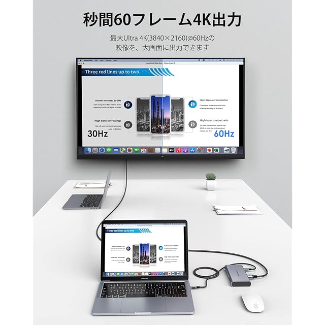 【高画質 4K@60Hz】HDMIポートを搭載し、最大4K@60Hz(3840×2160@60Hz)の出力解像度で、大画面で精細な画像を楽しめます。HDCP2.2とHDCP1.4にも対応です。*4K@60Hz出力対応の機種:11 インチ iPad Pro、12.9インチ iPad Pro (2018以降)、MacBook Pro (16 インチ,2019以降 )、MacBook Pro (15 インチ,2019 以降)、MacBook Pro (13 インチ,2020以降,M1/M2搭載)、MacBook Air (2020以降,M1/M2搭載)、iMac (Retina 5K, 27インチ, 2017以降),iMac (Retina 4K, 21.5-inch, 2017以降) 、 iMac Pro (2018)、lenovo yoga 14sなどのDP1.4対応Windowsパソコン