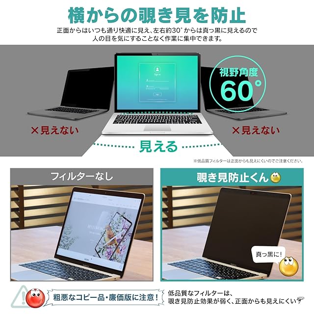 ▶▶▶【視野角度60°】:正面からはいつも通り快適に見え、左右約30°からは真っ黒に見えるので人の目を気にすることなく作業に集中できます。新幹線・カフェ・コワーキングスペース・オフィスなどでの作業効率アップにお役立てください。※低品質フィルターは正面からも見えにくいのでご注意ください。▶▶▶【リバーシブル仕様】:グレア(光沢)・アンチグレア(非光沢)のリバーシブル仕様。鮮明な映像を楽しみたい場合はグレア(光沢)、反射防止効果を重視する時にはアンチグレア(非光沢)面をご使用ください。※正面から見た場合の違いです。どちらの面も左右約30°からは真っ黒になります。