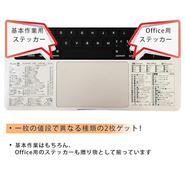 サイズ8.2cm*8.2cm(事前に貼付け場所サイズをご確認ください) 【システム操作用】(一枚) - YOUICHIステッカーは、Mac OSのシステム操作ショートカットです。作業効率を劇的に向上させます。 **すべての必須ショートカット** - YOUICHIのMac OSリファレンスキーボードショートカットステッカーで、重要なショートカットをすぐに確認できます。簡単に覚えられ、コマンド検索が速くなります。 **速くスマートに作業** - このツールでコンピュータ操作を迅速に習得し、ワークフローが大幅に向上します。学生から高齢者まで、あらゆる年齢・スキルレベル、自宅やオフィスで利用できます。 **品質** - 当社のビニール製ステッカーは耐久性があり、プロのオリジナルのデザインでOEMの外観を実現しています。専任のカスタマーサービスチームが迅速に対応し、問題を解決します。 **ベーシックから上級者まで** - 初心者からプロフェッショナルまで、YOUICHIステッカーは時間とストレスを軽減します。手頃な価格でコンピュータスキルを向上させることができます。 **あらゆるのMacBookに対応** - MacBook Pro/Air 13〜16インチ、iMac、Mac Mini。MacOS 使用可能です。