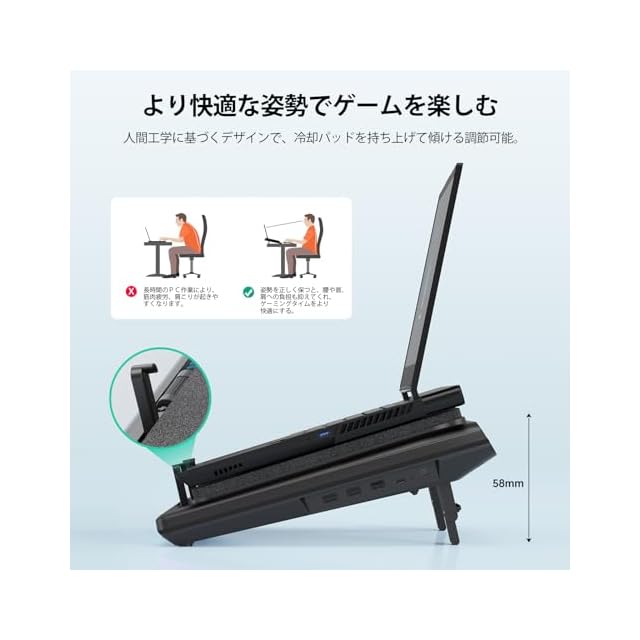 【3段階角度調節・15~19インチのPCに対応】人間工学に基づくデザインで、ノートパソコンスタンドとして、高さが三段階調節でき、テレワークや長時間のデスクワークにより、筋肉疲労、肩こりが起きやすくなり、この機能を活用して、姿勢を正しく保ち、腰や首、肩への負担も抑えてくれ、長時間の作業でも快適に過ごせるようになっています。♪汎用性が高いpc クーラーはAcer Nitro 5、MSIなど15〜19インチまでいろんなノートパソコンに対応可能。ゲーマーにとって、ゲームにとどまり、スムーズで中断のないゲームプレイを体験できるし、建築設計士やVloggerに対しても、映像編集、画像処理など重たいデータを処理するときの負荷による発熱を大幅に低減し、せっかくそれまで行っていた作業のデータを損失する心配もなく、大切なノートパソコンの性能をしっかりサポート。