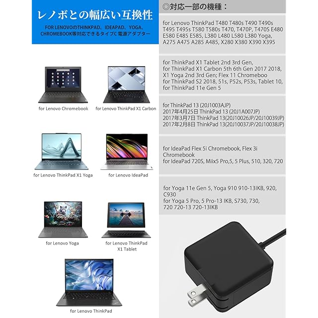 【Lenovo用 ノートパソコン充電器の製品仕様】本製品はfor レノボ/Lenovo ThinkPad用ノートパソコンに交換用タイプC ACアダプター(45W 20V-2.25A)で、レノボ用 ACアダプターの純正品ではありません。電源アダプターの製品仕様==入力:100-240V 50-60Hz 1.5A; 出力45W: 5V-3A, 9V-3A, 12V-3A, 15V-3A, 20V-2.25A, PPS: 3.3-11V/3A。タイプC ケーブルの長さ:1.5m、端末コネクタタイプ:USB-C。