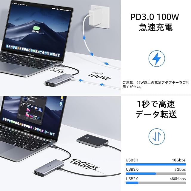 【幅広い互換性&ドライバ不要】 このラップトップ・ドッキング・デュアルモニターを購入する前に、お使いのノートパソコンに Thunderbolt またはフル装備の USB-C ポートがあることを確認してください。 ドッキングステーションには、USBデバイスの使いやすさを拡張できます。(ディスプレイ、充電、データ転送プロトコルなどをサポート)マウス、キーボード、HDMI、ゲーム機、充電等を一気に出来できます。ドッキングステーションは、 MacBook Pro/Air、iPad Pro、Windows、Linux向け