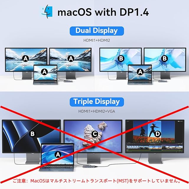 【トリプルディスプレイとUltra HD 4K HDMI出力高清視覚体験】WindowsシステムはMSTとSST(Mirror & Extend Mode)をサポートします。HDMI 1はDP1.4ソースで4K 60Hzまで出力できます。HDMIの解像度は、2つのモニタを同時に再生する場合は4K@30Hzになり、VGAとのデュアルまたはトリプルディスプレイの場合は1080P@60Hzになります。ご注意:Mac OSはトリプルディスプレイをサポートしていません。ミラーモードと非ミラーモードのみをサポートしています。非ミラーモードとは、3つの外部モニターが同じで、ラップトップとは異なることを意味します。