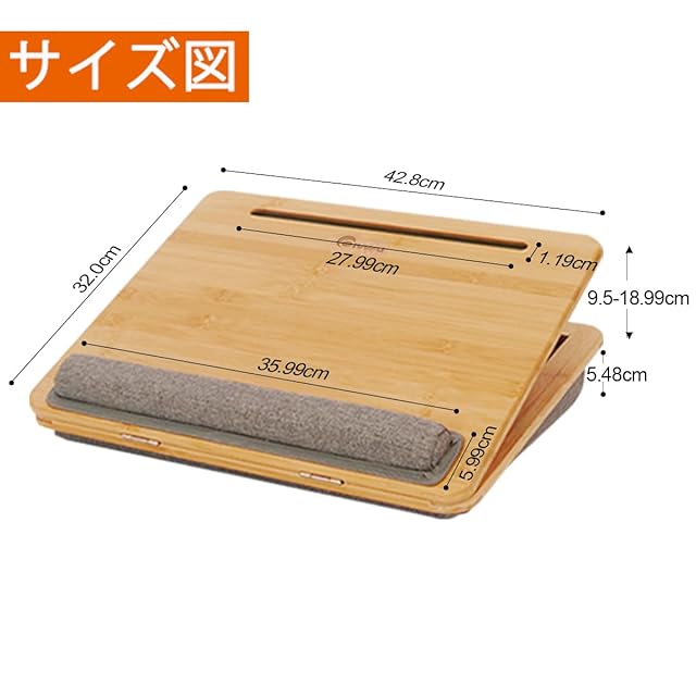 【仕様】パネルサイズ42cm x 32cm。天板の角度:13° / 22.5° / 28° / 32°(4段階調節可能)。リストレスト(手置き場)サイズ:36cm x 6cm。スロットのサイズ:28cm x 1.2cm。 材質: 天然竹、リネン素材+高反発スポンジ(クッション) 。 重量: 1.8kg