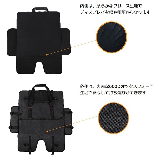 内側は、柔らかいフリース生地でディスプレイを傷や衝撃から守り、外側は、丈夫な600Dオックスフォード生地で安心して持ち運びができます。