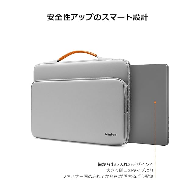 軍用規格の360°全面保護】このパソコンキャリングバッグは四角にある特許取得のゴム「CornerArmor」クッション、PCをフル周る厚手の高弾性エッジやふわふわとしてフランネル裏地の組合せは、超強耐衝撃力でパソコンを衝撃や意外の落下から守り、2020年9月10日に軍用落下試験(規格MIL-STD-810H:2019)をクリアしました。<br/> 【パワフルで一目瞭然の収納システム】コンパクトでながら3室。大きなフロントポケットに複数なポケットとAirTagや鍵掛用ストラップを配し、アダプタ・ケーブル・ハブ・iPad Air/Proなどをスッキリ収納・整理できます。背面にもポケットがあり、書類やICカードなどよく出し入れのモノを収納できます。<br/> 【品質と機能の両立】高品質の撥水加工されてエコ材表地、安心のYKK製ファスナー、裏生地の洗練されたライン模様、及びしっかりとした作りでMacBook用手提げバッグの最高レベル達成。環境保護の責任を役たすために、このパソコンケースはプラスチックの再生材表地を使用することにより、何十万の廃棄ペットボトルをリサイクルして利用しました。tomtoc製品は全て12ヶ月間安心付きます。<br/> 【安全性・利便性アップの短辺開口】革新的に開口をサイドの1辺に設置します。この横から出し入れのデザインで底辺開口と3辺フル開口のタイプより、ファスナー閉め忘れてからノートPCが落ちってしまうご心配無。バッグインバッグとして使われる場合、縦型のバッグのようにノートPCの出し入れが非常に便利。<br/> 【仕様】内寸:360 × 250 × 20mm。16インチ MacBook Pro 2024-2019 M4/M3/M2/M1 Pro/Max (モデルA3403 A3186 A2991 A2780 A2485 A2141)にピッタリ対応。15.6型 富士通 FMV Lifebook AHシリーズ 2020-2022発売モデル | ASUS Vivobook 15X OLED | Dell XPS 15 | 15インチ Surface Book | 15.6型 Lenovo ThinkPad X1 Extreme (2019) | 15.6 Lenovo IdeaPad Slim 570iにも対応。