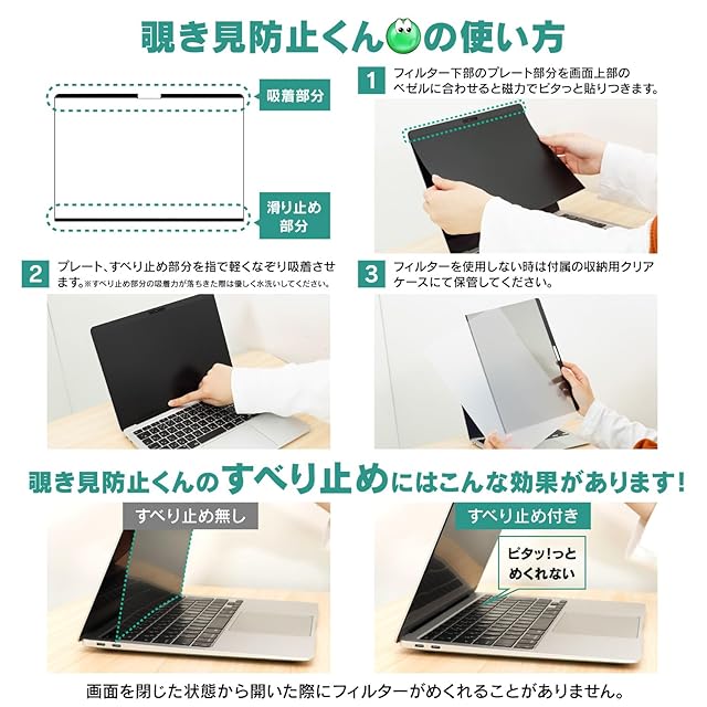 ▶▶▶【着脱が超簡単】:金属プレート部分がスゥっと貼りつくので位置合わせが簡単です。外す時もパッと外せるので、”使いたい時にだけ”簡単に使えます。【すべり止めで”めくれない”】:覗き見防止くんはフィルターのズレを防ぐすべり止めが付いており、液晶開閉の際にフィルターがめくれてしまうのを防ぎます。すべり止め部分は特殊な加工となっており、ノリ跡などは付きません。※すべり止め部分の吸着力が落ちてきた際は優しく水洗いしてください。