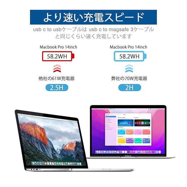 【Macの高速充電】わずか30分でMacBook Pro 14インチ(M3 2023)またはMacBook Air 13インチ(M3 2024)を50%まで充電できます。この70WのType-C充電器は、M1、M2、M3 Pro Maxチップに対応し、優れた充電安定性と効率を提供します。96Wや140Wの充電器よりもコンパクトながら、強力な電力を提供します。