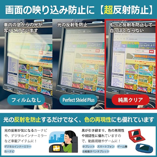 <b>■おどろきの反射防止レベル!</b><br>純黒クリア Premium Matte Shield【超反射防止】保護フィルムは、反射率が脅威の0.5%!保護フィルム業界最高レベルです。<br>一般的な反射低減(アンチグレア)フィルムと比較して大幅に反射を抑えます。<br><br><b>■黒が際立つ! 高透過率</b><br>一般的な反射低減(アンチグレア)フィルムは画面が白っぽくなりますが、この純黒フィルムは高い透過率で白くならず黒が引き締まり、色の再現性や視認性に優れています。<br>反射が気になるカーナビや、デジタルインナーミラーなど車載アイテムにもおすすめです!<br><br><b>■指すべりさらさら防汚加工!ゲーム操作も快適</b><br>さらさらの指滑りで快適な触り心地。フリックやスライドがしやすいので、ゲーム好きな方にイチ押しです。<br>指紋や皮脂汚れをはじく防汚コーティングで、汚れても拭けばすぐにきれいになります。<br><br><b>■気泡の入りにくい特殊な自己吸着タイプ</b><br>接着面は気泡の入りにくい特殊な自己吸着タイプです。素材に柔軟性があり、貼り付け作業も簡単にできます。また、はがすときにガラス製フィルムのように割れてしまうことはありません。<br>貼り直しが何度でもできるので、正しい位置へ貼り付けられるまでやり直すことができます。<br><br><b>■安心の日本製</b><br>最高級グレードの素材を日本国内の弊社工場で加工している Made in Japan です。安心の品質をお届けします。<br>