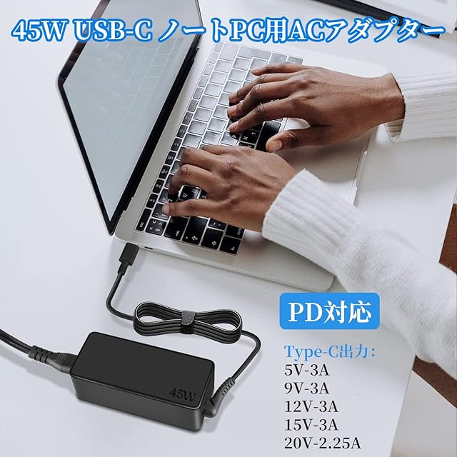 【製品仕様】入力:AC100-240V 50/60 Hz 1.3A、出力:5V-3A,9V-3A,12V-3A,15V-3A,20V-2.25A 45W。DCケーブルの長さ:1.7m、ACケーブルの長さ:1m、DCコネクタタイプ:USB-C。(この充電器をご購入する前に、お使いデバイスの入力電圧と電流及びインターフェースタイプなどをご確認ください。)