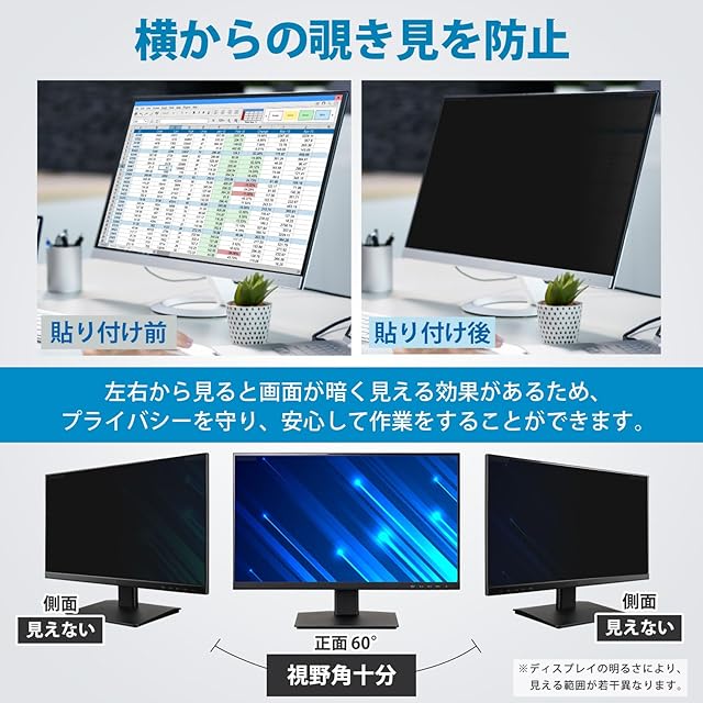 ★プライバシー保護:正面からの視認性を保ちつつ、側面からの覗き見を防ぐことができます。約60度の視野角(左右30度)を越えると、画面が暗く表示されるため、職場や自宅で作業をしていても情報の漏洩リスクを回避することができます。 フィルター部分のみの寸法:479mm x 273mm