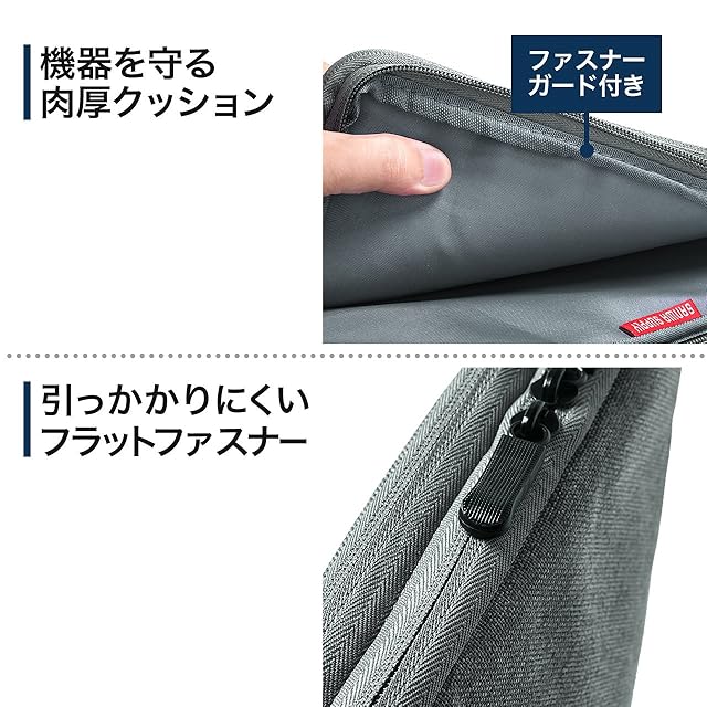 厚さ約3mmのクッションで パソコン や小物をしっかり守ります。また、ファスナーガード付きで、収納した機器へのキズを防ぎます。