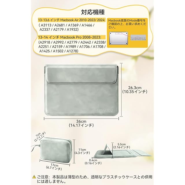 【対応機種】市販された13インチから14インチのパソコンに対応可能。13-13.6 インチ Macbook Air 2010-2024 M1 / M2 /M3 チップス: (A3113 / A2681 / A1369 / A1466 / A2337 / A2179 / A1932); @13-14インチ Macbook Pro 2008-2024 M1/ M2/ M3チップス: (A2159 / A1989 / A1425 / A1502 / A1278 / A1706 / A1708 / A2251 / A2338 / A2442/ A2918 / A2992 / A2779) Macbook底面のMode番号をご確認の上お買い求めください。ご注意:本製品は薄型のため、透明なプラスチックケースとの併用には適しません。