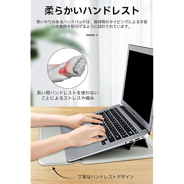【PCスタンド &フレキシブルのハンドレスト 】保護ケースとパソコンスタンドが一体化したデザインになり、利便性と実用性がさらに向上しました。カバーの背面には折りたたみ式のスタンドがついており、スタンド機能を使用後、猫背や首の曲がった状態を防ぐのにも役立ちます。長時間のタイピングによる手首への負担を軽減するソフトEVA ハンドレストも付属。ブラケットは熱を逃がす働きもあり、PCの性能を落としにくくしています。スタンド部分には丈夫な板紙を採用、耐久性に優れています。