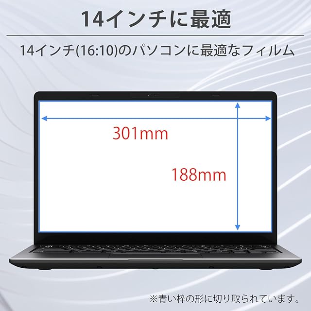 【対応機種サイズ・画面比率】:14インチ 16:10(フィルム寸法:301*188mm)※モニターのサイズは同じインチ数でも機種によってばらつきがあるため、詳細のサイズを事前に確認されることをおすすめいたします。