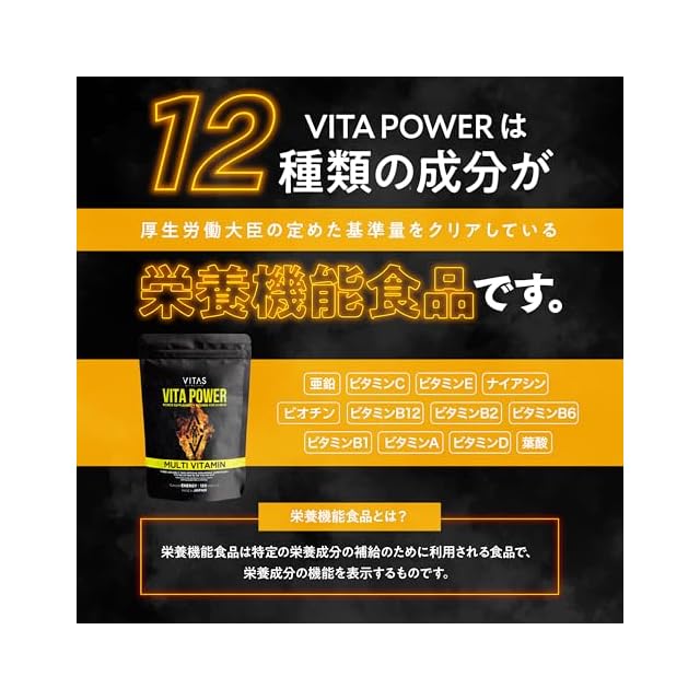 【栄養機能食品】VITAPOWERは、厚生労働省が定める基準を満たした栄養機能食品(亜鉛/ビタミンC/ビタミンE/ナイアシン/ビオチン/ビタミンB12/ビタミンB2/ビタミンB6/ビタミンB1/ビタミンA/ビタミンD/葉酸)。バランスの良い食生活とあわせて、ご活用ください。