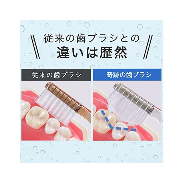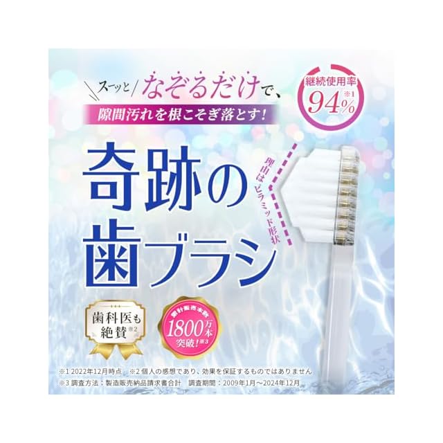 『奇跡の歯ブラシ』は独自のピラミッド形状の毛束が歯と歯のすき間や、歯と歯ぐきの境目の見えない汚れも効率良く落とし、どなたでも磨き残しが少なくなる歯ブラシです。 歯に物が詰まりやすい方、歯並びが悪い方、お子様にもお使い頂けます。