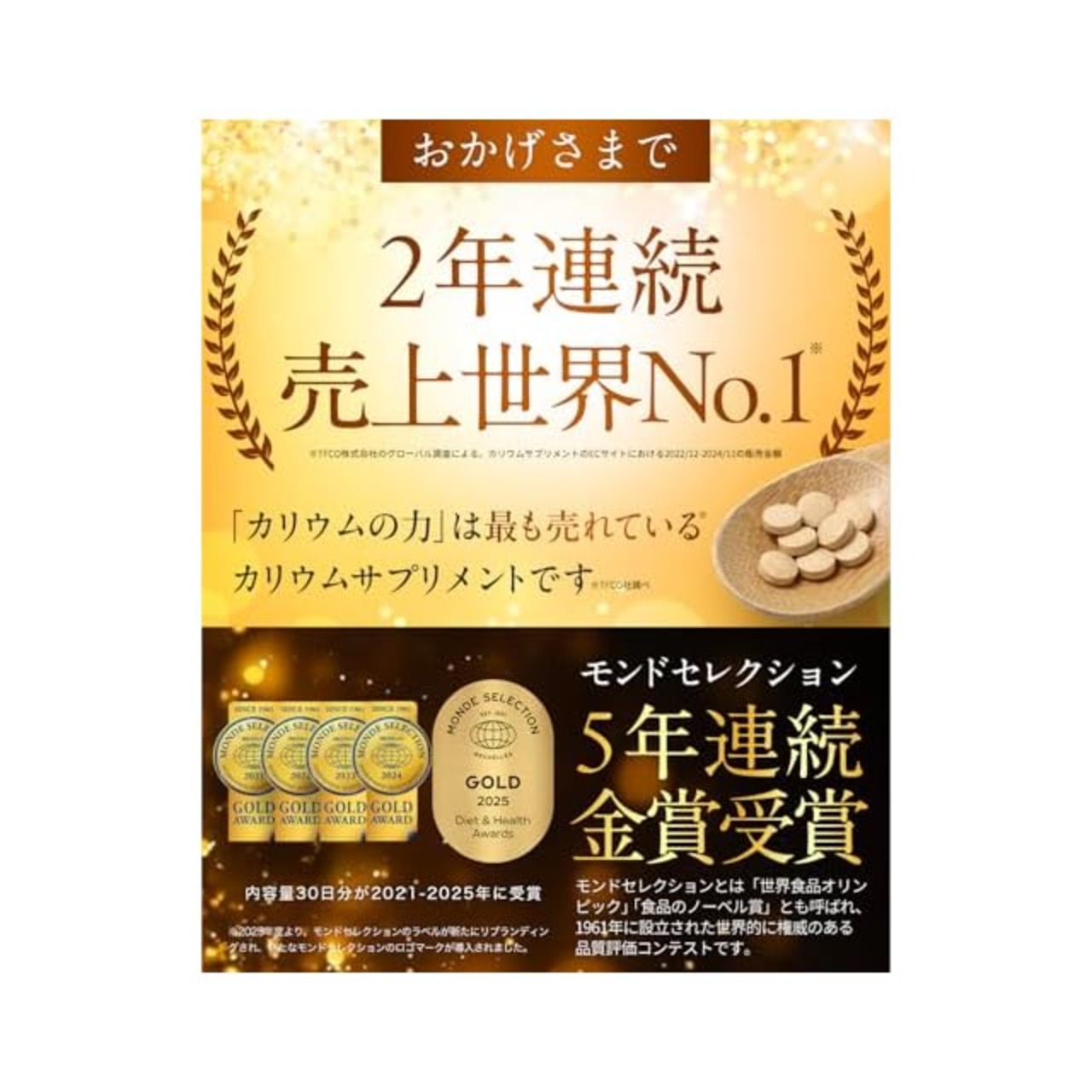 ✅【2年連続売上世界No1】「カリウムの力」は2年連続で世界で最も売れているカリウムサプリメントです。※TFCO株式会社のグローバル調査による。カリウムサプリメントのECサイトにおける2022/12〜2024/11の販売金額。