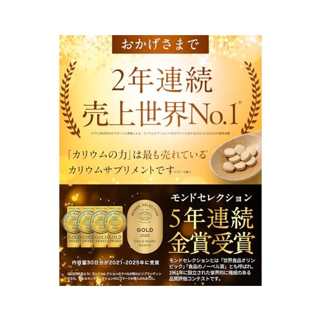 ✅【5年連続モンドセレクション金賞】「カリウムの力」は2021年、2022年、2023年、2024年、2025年と5年連続でモンドセレクション金賞を受賞しました。