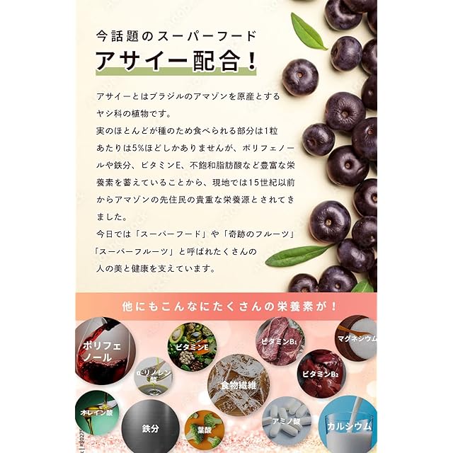 ✅注目のスーパーフード アサイーエキス配合! アサイーは南米原産の果実で、ポリフェノールや鉄分、カルシウム、ビタミン類などを含むことで知られ、世界的に愛用されているスーパーフードです。豊富な栄養成分を含むことから、健康や美容を意識する方に注目されています。 本商品「カリウム生活」では、このアサイーに加えて、10粒中1,200mgの塩化カリウムを高配合。さらに「ビタミンB₁・B₂・B₆」を含み、栄養機能食品の基準を満たしています。 そのほか「ザクロエキス」「赤ブドウエキス」「133種類の植物発酵エキス」なども配合し、多彩な栄養素をバランスよく摂取できるよう設計しました。アサイーの魅力とカリウムの力を一度に取り入れたい方におすすめです。 ✅カリウム生活でスッキリ本来のあなたへ。 カリウム生活は10粒中塩化カリウム1200mgの高配合! !カリウム生活に含有されている3種類のビタミンB₁B₂B₆は栄養機能食品として表示できる基準値を含んでいます。さらに嬉しい成分「ザクロエキス」「赤ブドウエキス」「133種類の植物発酵エキス」「ビタミンB₁、B₂、B₆」「アサイーエキス」も配合でしており、スッキリ、パンパン対策をサポート!