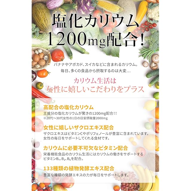 ✅【こんなお悩みありませんか?】立ち仕事でパンパン・・化粧ノリが悪い・・塩分高めの食事が大好き! バナナやアボカドなどに多く含まれるカリウムはナトリウムとのバランスをとり、パンパン対策のサポートをしてくれるミネラルの一種です。 運動不足や塩分過多の食事が多いライフスタイルの現代人には欠かせませんが、毎日の食事で摂取するのは大変ですよね・・・ 。カリウム生活は10粒中塩化カリウム1200mgの高配合で、忙しい現代人を応援します!
