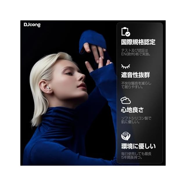【JIS認証イヤープラグ!圧迫感ゼロ!】「遮音性は良いのに耳が痛い」「フィット感にこだわったら音漏れする...」従来の耳栓睡眠用完全遮音でこんなお悩みありませんか?DJcongいびき防止グッズは新開発の超柔軟シリコンを採用。人間工学に基づいた3D設計で、一晩中横向き寝でも圧力ゼロ。朝起きても「いびき耳栓つけてたの忘れる」レベルの快適さ。当社では、お客様に安心して製品をご利用いただくため、日本国内で信頼される検査・認証機関「JIS(日本工業規格)」の厳格な審査基準を取得済みです。さらに、肌への刺激やアレルギー反応を未然に防ぐため、527人の被験者協力のもと、アレルギーテストを実施しています。デリケートな肌の方にもご使用いただけますよう、配慮を重ねております。