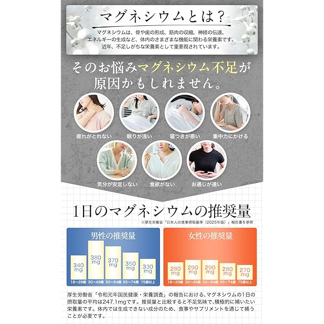 ✅【栄養機能食品( Mg )】マグネシウムは、骨や歯の形成に必要な栄養素です。マグネシウムは、多くの体内酵素の正常な働きとエネルギー産生を助けるとともに、血液循環を正常に保つのに必要な栄養素です。