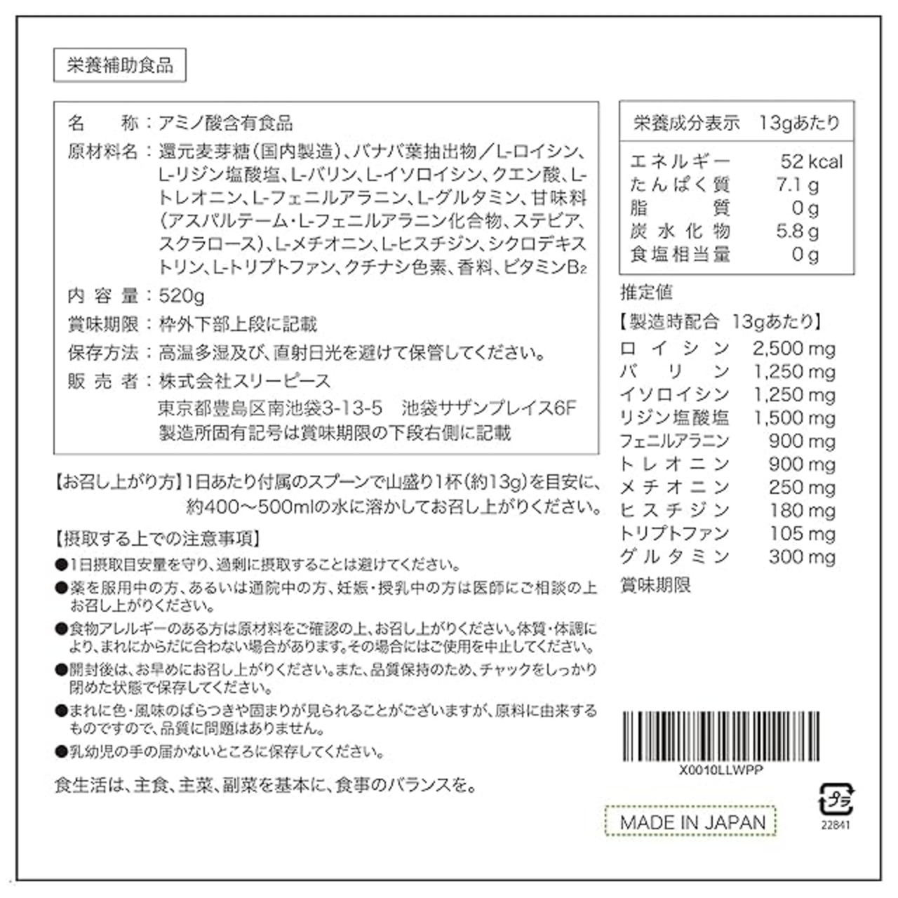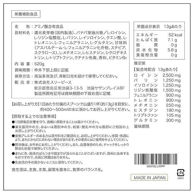 ロイシン:2,500mg、バリン:1,250mg、イソロイシン:1,250mg リジン:1,200mg、フェニルアラニン:900mg、 トレオニン:900mg、 メチオニン:250mg、ヒスチジン:180mg、トリプトファン:105mg