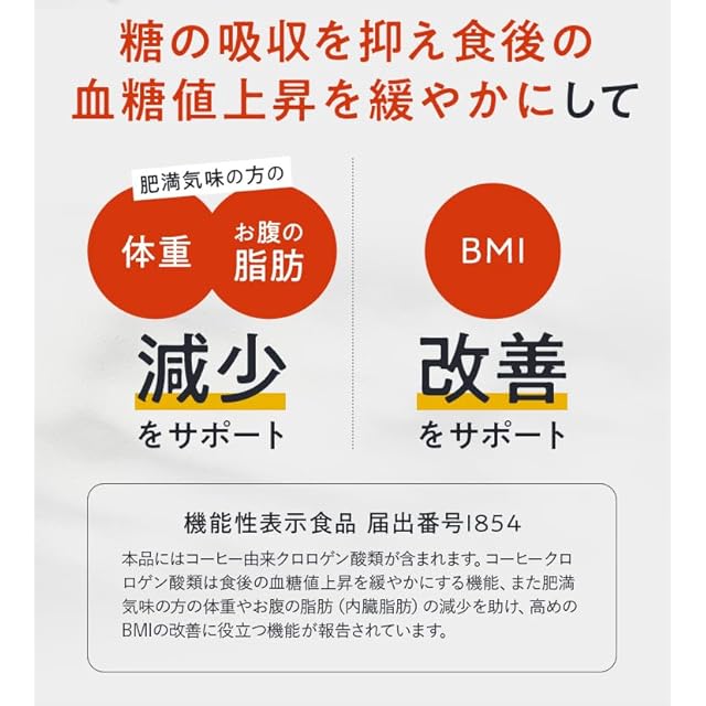 【届出表示】本品にはコーヒー由来クロロゲン酸類が含まれます。コーヒー由来クロロゲン酸類は食後の血糖値上昇を緩やかにする機能、また肥満気味の方の体重やお腹の脂肪(内臓脂肪)の減少を助け、高めのBMIの改善に役立つ機能が報告されています。
