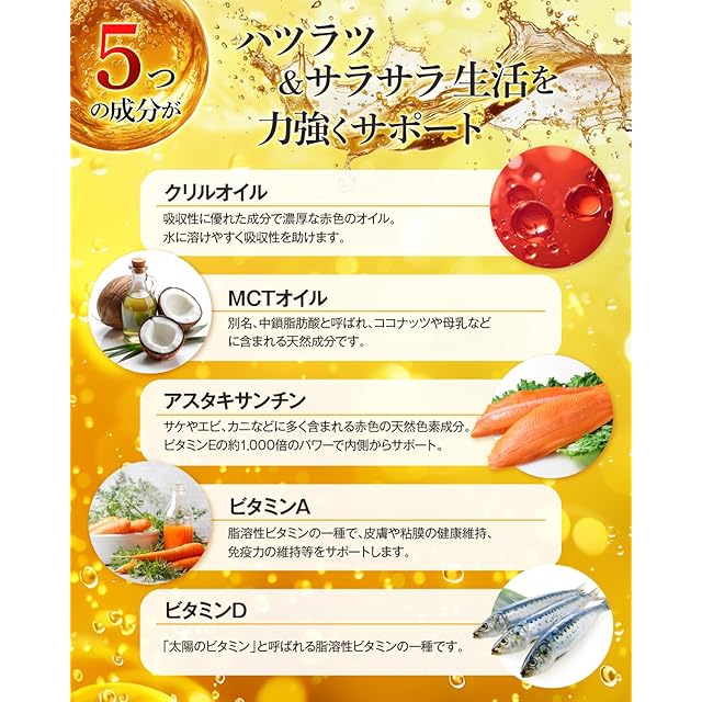 【しっかり吸収をサポートする成分も充実配合】3大成分DHA、EPA、クリルオイルの体内吸収をサポートするため、アスタキサンチン、MCTオイル、ビタミンA、ビタミンDを充実配合。ハツラツ&サラサラ生活を力強くサポート。