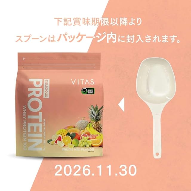 【VITAS デリシャスプロテインフルーツミックス風味】美味しさ、溶けやすさ、成分にとことんこだわったプロテイン。厳選された乳清たんぱくを使用。毎日の栄養補給に最適で、トレーニングや美容をサポートします。