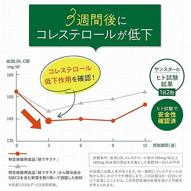 サンスターが研究開発した日本で唯一野菜の力(SMCS)でコレステロールを下げる特定保健用食品。1日2缶飲み続けることでLDLコレステロールを低下させる結果がヒト試験で出ています。