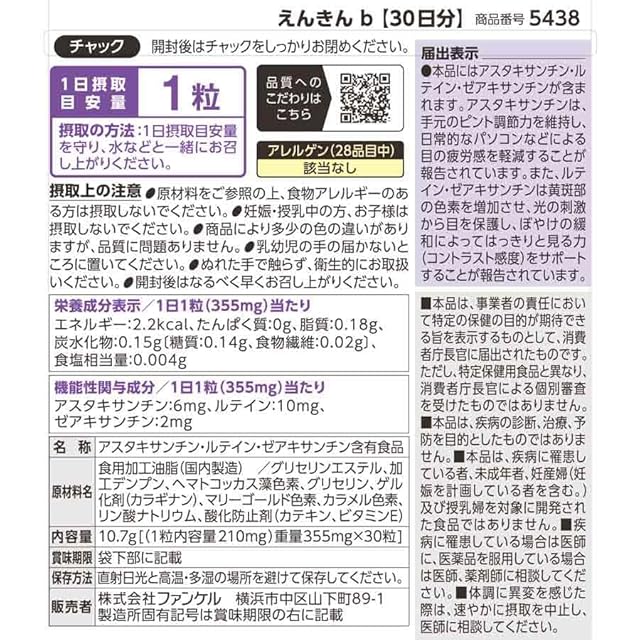 【大人の目のお悩みに】<br>手元のピントが合いづらい、目の疲労感が気になる、小さな文字がぼやける、午前中に比べて夕方見えにくい…など、大人の目のお悩みに。<br>「えんきん」は、ファンケルが厳選した3成分アスタキサンチン、ルテイン、ゼアキサンチンを複合配合した機能性表示食品です。<br>手元のピント調節力を維持し、目の疲労感を軽減する機能、光の刺激から目を保護し、ぼやけの緩和によってはっきりと見る力をサポートする機能(※)が確認されています。<br>クリアな毎日のために、早めのケアを始めましょう。<br>※機能性関与成分による研究レビュー<br><br> 【機能性表示食品】<br>[届出番号:E700]本品にはアスタキサンチン・ルテイン・ゼアキサンチンが含まれます。アスタキサンチンは、手元のピント調節力を維持し、日常的なパソコンなどによる目の疲労感を軽減することが報告されています。<br>また、ルテイン・ゼアキサンチンは黄斑部の色素を増加させ、光の刺激から目を保護し、ぼやけの緩和によってはっきりと見る力(コントラスト感度)をサポートすることが報告されています。 <br><br>【内容量】<br>90日分<br><br>【1日の目安】<br>1粒 <br><br>【機能性関与成分/1日1粒当たり】<br>アスタキサンチン:6mg、ゼアキサンチン:2mg、ルテイン:10mg 【機能性表示食品についてのご注意】※消費者庁長官による個別審査を受けたものではありません。<br>※疾病の診断、治療、予防を目的としたものではありません<br>※食生活は、主食、主菜、副菜を基本に、食事のバランスを。<br><br> 【アレルゲン(28品目中)】<br>該当なし <br><br>【ご注意】<br>※妊娠・授乳中の方、お子様はお召し上がりにならないでください。