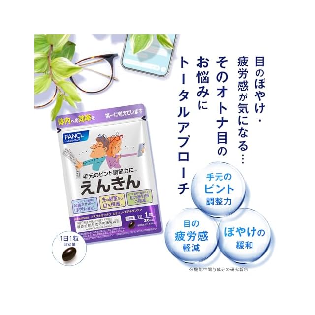 【大人の目のお悩みに】手元のピントが合いづらい、目の疲労感が気になる、小さな文字がぼやける、午前中に比べて夕方見えにくい…など、大人の目のお悩みに。「えんきん」は、ファンケルが厳選した3成分アスタキサンチン、ルテイン、ゼアキサンチンを複合配合した機能性表示食品です。手元のピント調節力を維持し、目の疲労感を軽減する機能、光の刺激から目を保護し、ぼやけの緩和によってはっきりと見る力をサポートする機能(※)が確認されています。クリアな毎日のために、早めのケアを始めましょう。※機能性関与成分による研究レビュー