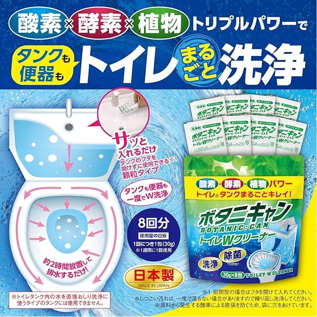 <b>酸素×酵素×植物のトリプルパワーでトイレタンクと便器をまるごと洗浄!</b><br><br>トイレタンクに1袋入れるだけ!<br>手間なく簡単にトイレ掃除ができる、トイレタンク洗浄剤です。<br>酸素(さんそ)・酵素(こうそ)・植物の3つの力でトイレの便器とタンクを傷めずに汚れを落とします。<br><br>【酸素(さんそ)】<br>過炭酸ナトリウムが酸素を発生。<br>発泡効果により、トイレタンク内の水垢汚れを除去。<br><br>【酵素(こうそ)】<br> タンパク質汚れを分解。<br><br>【植物】<br>植物由来の石けん成分(脂肪酸ナトリウム)が皮脂汚れを洗浄。<br><br>便器やトイレタンク内部の悪臭の原因となる黒カビや水アカ、黄ばみ、ヘドロ汚れを分解、除菌します。<br>さらに、気になるトイレの臭いに緑茶エキス、カキタンニンも配合。<br><br><b>【注意】<br>トイレタンク内の水を直接おしり洗浄に使うタイプのタンクには使用できません。</b><br><br>【内容量】30g×8包<br>【液性】弱アルカリ性<br>【使用目安】1回につき1包(30g)<br><br><b>■ご使用方法■</b><br>【トイレタンクの洗浄の場合】<br>一度排水して、給水時にタンクに洗浄剤を1袋(30g)入れて2時間程度放置し、タンク内の水を排水してください。<br>※タンクのフタに穴がない場合はフタを開けて、穴がある場合は穴から洗浄剤を入れてください。<br>※しつこい汚れは一度で落ちない場合がございます。<br>繰り返しご使用いただくか、2袋入れて洗浄してください。<br>※タンク内部の水面より上の汚れは落とせません。<br>洗浄剤を入れた後、お手持ちの歯ブラシなどでこすり洗いしてください。<br><br>【トイレの水たまり部分の洗浄の場合】<br> 水たまり部分に洗浄剤を1袋(30g)入れて2時間程度放置し、タンク内の水を排水してください。<br>※放置時間が長いほど効果的です。<br>※しつこい汚れの場合はお手持ちのブラシ等でこすり洗いしてください。<br> 冬場はぬるま湯(40℃以下)水たまり部分に入れて水温を上げるとより効果的です。<br><br><b>■応急処置■</b><br>・目に入ったり、皮膚に着いた場合は、こすらず流水で15分以上、洗い流してください。<br>・万一、飲み込んだ場合はすぐに多量の水・牛乳を飲ませる等の処置をしてください。<br>※その際無理に吐かせず、いずれの場合も応急処置後、医師に相談してください。受診時には必ず本品を持参してください。<br>