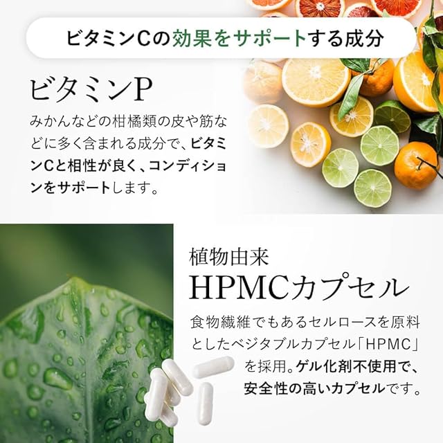 ビタミンCとの働きを助けるビタミンP(ヘスペリジン)も配合。ビタミンPはビタミンCとの相性が非常に良く、守りのビタミンCと高めるビタミンPでより相乗効果が期待できます。