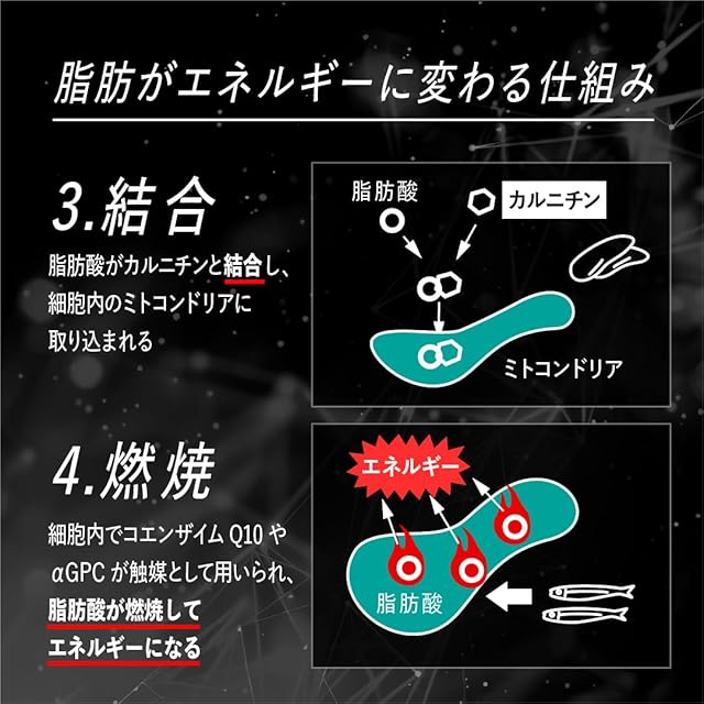 【オススメの飲み方】1回3カプセルを目安に1日2回をお飲みください。トレーニングする日はトレーニング前、お食事後がオススメです。トレーニングしない日は日中、お食事後がオススメです。【原材料名】L-カルニチンL酒石酸塩、ショウガ抽出物(ショウガ抽出物、デキストリン)、コエンザイムQ10、αリポ酸/セルロース、緑茶エキス、プルラン、カフェイン抽出物、ナイアシン、ステアリン酸カルシウム、微粒酸化ケイ素
