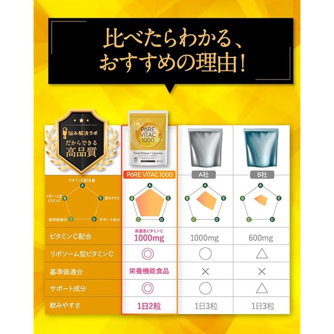 商品名:【リポソームビタミンC配合】ピュアビタC 高濃度 ビタミンC サプリ 1,000mg リポソームビタミンC 60日分 120粒入り L-リジン タイムリリース × リポソーム 独自配合 栄養機能食品 悩み解決ラボ 持続型ビタミンc