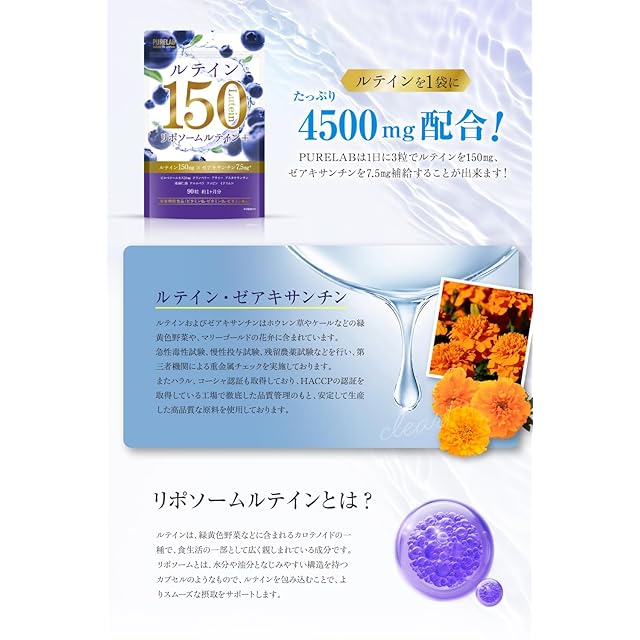 ✅【ルテイン×ゼアキサンチン 配合】 PURELABは、1日3粒でルテイン150mgとゼアキサンチン7.5mgを配合。 ルテインは、マリーゴールド由来のフリー体原料を使用しています。 【リポソームルテイン配合】 リポソームとは、水分や油分になじみやすい構造を持つカプセルのようなもので、成分を包み込むことで摂取しやすい設計となっています。