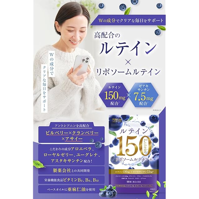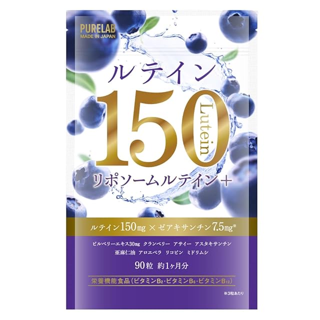 商品名:PURELAB ルテイン150㎎×ゼアキサンチン7.5㎎【リポソームルテイン配合】サプリメント ブルーベリー ビルベリー30㎎ 90粒 約30日分 日本製