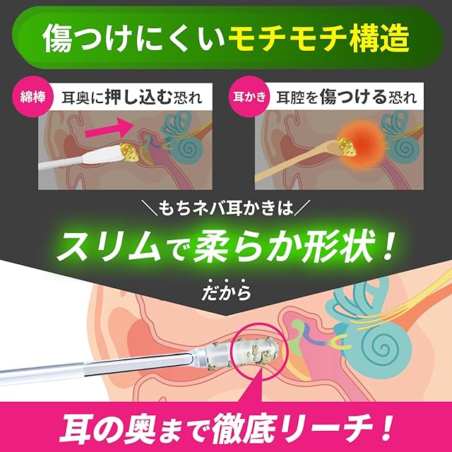 痛みゼロの強力粘着もちネバ耳かきは、耳の奥までスッキリ取れる優れものです。<br> たっぷり使える24本入りなので、家族や友達にもシェアして使用いただけます。<br> 耳かきの先端はやわらかく、傷つけることなく耳の奥の汚れを取り除けます。<br> 水洗いした後、ドライヤーで粘着力が復活するので、何度でも使用することができます。<br> コンパクトなので持ち運びにも便利です。<br> 耳の健康を守りながら、快適な耳掃除を実現するアイテムです。<br><br> 【強力な粘着力】特殊シリコンが耳垢をしっかりキャッチ。奥にこびりついた耳垢もスッキリ取れます。<br> 【スリムで奥まで届く】細長いデザインで耳の奥まで簡単に届き、効率的に掃除。<br> 【柔らかくて安心】柔らかなシリコン素材が耳を傷つけず、優しく耳垢を除去します。<br> 【繰り返し使える】水洗い後、ドライヤーで粘着力が復活し、何度でも使えます。