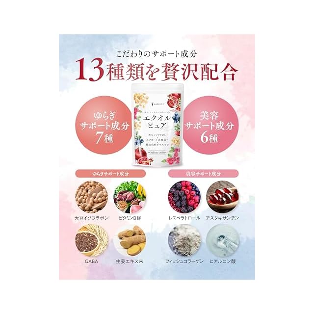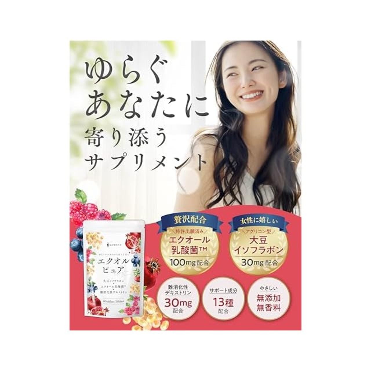 【エクオール乳酸菌100mgとアグリコン型大豆イソフラボンを30mg(1日分) 贅沢配合】エクオールの『直接摂取』×『産生のサポート』をダブルで実現したエクオール乳酸菌を100mgと贅沢配合。加えて、エクオール生成に必要なアグリコン型大豆イソフラボンを30mgも配合。 【女性に嬉しい各種美容成分もたっぷり配合】女性に嬉しい美容成分であるヒアルロン酸、レスベラトロール、アスタキサンチン、フィッシュコラーゲン、GABA、ビタミンB群(B6、B2、B1、B12など)をたっぷり配合。 【国内GMP認定工場で製造されたエクオルピュア】エクオルピュアは、品質管理に徹底的に配慮した国内GMP認定工場で生産されています。すべての過程において「一定の品質」が保たれるように生産工程を管理し、製造しております。 【エクオルピュアはこんな方におすすめ】エクオルピュアは、忙しい毎日をサポートしたい女性におすすめです。エクオール乳酸菌100mg+アグリコン型イソフラボン30mg(1日分)を含み、女性に嬉しい成分が贅沢に配合されています。 【長く続けて欲しい理由】飲みやすくニオイも気にならない小粒なタブレットです。 【内容量】180粒(約90日分)45g 【お召し上がり方法】1日2粒を目安に、水またはぬるま湯でお召し上がりください。 【保管方法】直射日光・高温多湿の場所を避けて保管してください。【原材料名】マルチトール(国内製造)、エクオール乳酸菌発酵エキス含有粉末(デキストリン、乳酸菌発酵エキス〔大豆を含む〕、梅エキス、海洋深層水)、大豆抽出物、難消化性デキストリン、高麗人参エキス末、赤ワインエキス末、コラーゲンペプチド(ゼラチンを含む)、γ-アミノ酪酸(ギャバ)、ショウガ末、α-リポ酸/セルロース、ナイアシン、ステアリン酸Ca、微粒酸化ケイ素、CMC、ビタミンB₆、ビタミンB₂、ビタミンB₁、ヒアルロン酸、ヘマトコッカス藻色素、ビタミンB₁₂ MADE IN JAPAN